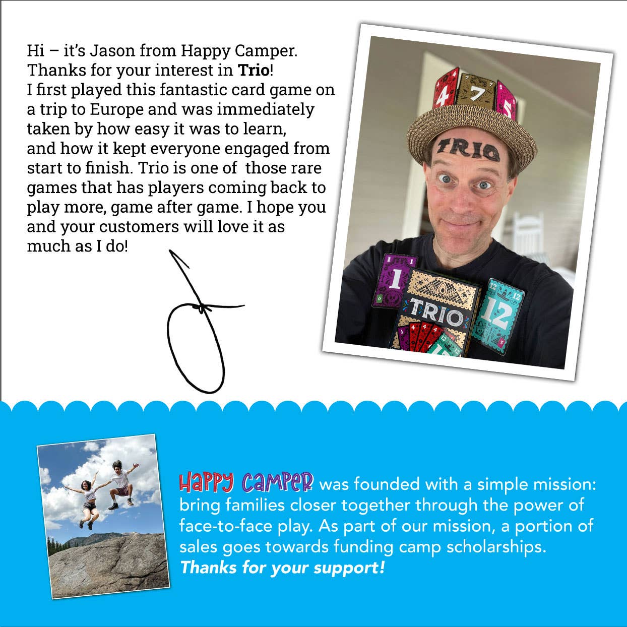 Play the hottest new card game out of Europe! Can you find three of a kind? * Reveal two cards – either from the middle, or by asking any player for their lowest or highest card. * If you find a pair, keep playing. Get three of a kind and collect the trio. But if the numbers ever don't match – the cards go back! * With a little memory and a little luck, winning is easy as 1... 2... 3! A clever card game that's full of surprises!