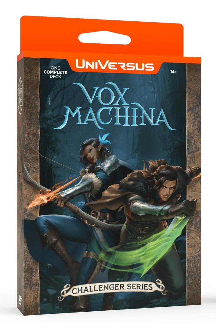 Whether diving into dungeons or exploring the wilderness, the characters from Critical Role are always ready for a good time! UVS Games is bringing the exciting world of Exandria, home to the many campaigns of Critical Role, to UniVersus! These 2 brand new decks are great for new and established UniVersus players alike! Each Challenger Series includes a collector booster pack, featuring 6 alternate art foil cards! Each Challenger Series is an advanced, ready-to-play 60 card deck that includes 2 different characters.2 Character options give you more ways to play each deck! Featured in the Vox Machina deck are Vex'ahlia and Vax’ildan, while featured in the Mighty Nein deck are Nott and Jester. Contents:1 Display, 4 Vox Machina Challenger Series, 4 Mighty Nein Challenger Series. Each Challenger Series includes a ready-to-play 60 card deck AND collector booster pack!