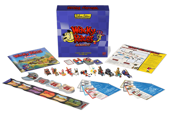 Wacky Races: The Board Game puts players in the "driver's seat" with control of their favorite drivers from the cartoon series, including The Slag Brothers, The Gruesome Twosome, Penelope Pitstop, Peter Perfect, and more, each with their own car equipped with special abilities. They compete against each other as well as the game-controlled, mustachioed Dick Dastardly and his wheezy pup Muttley. Races are simple, yet strategic, as players place cards indicating the terrain tiles to which their racer will move, with the last card played indicating where Dastardly and Muttley will end up. However, it wouldn't be wacky without a little trouble standing in the way. Racers need to dodge or negate traps set by Dastardly as he attempts to stay ahead of the pack. Racers can choose between single races lasting 10-15 minutes or the Championship mode, which offers unique rulesets changing from race-to-race before a winner is named. This deluxe edition includes pre-painted miniatures.
