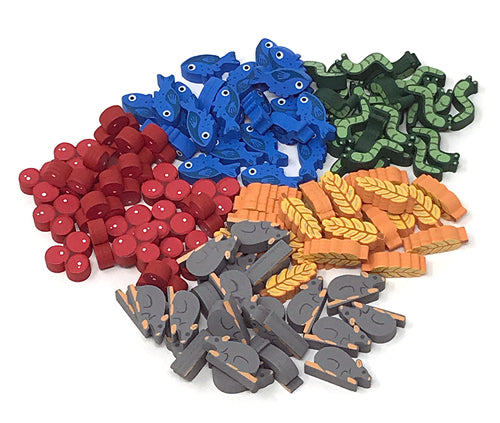 This 105-piece game upgrade kit for Wingspan contains 21 painted wooden pieces for each of the 5 bird food types.